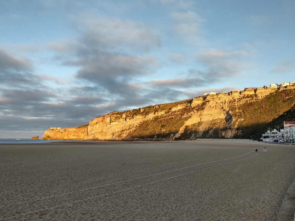 [Above photo: Promontorio do Sitio in Nazare, Portugal with the lighthouse at the far left, on top of the little stone fort. From there in April 2024 you could have seen, when storm-driven waves rushed from the Atlantic through the unusual deep canyon system, Sebastian Steudtner surf the face of a world-record 93.7 ft wave. ]