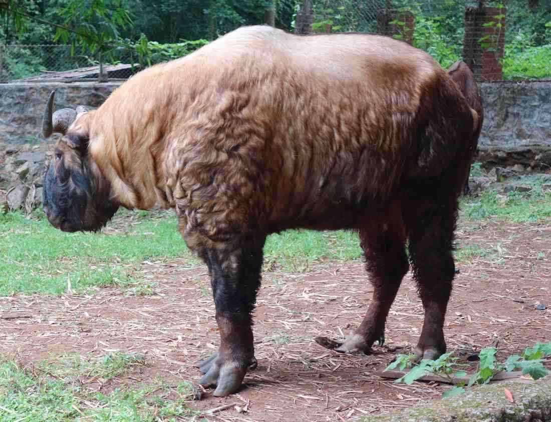 [Above photo: A takin or gnu goat, a large ungulate found in the Eastern Himalayas, looking depressed in the National Kandawgyi Botanical Gardens.]