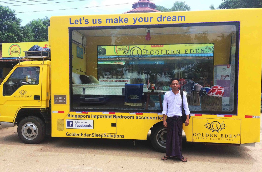 [Above photo: Dr. Thura Lin in front of a clever marketing approach, if your dream is to have “Singapore imported bedroom accessories.”]