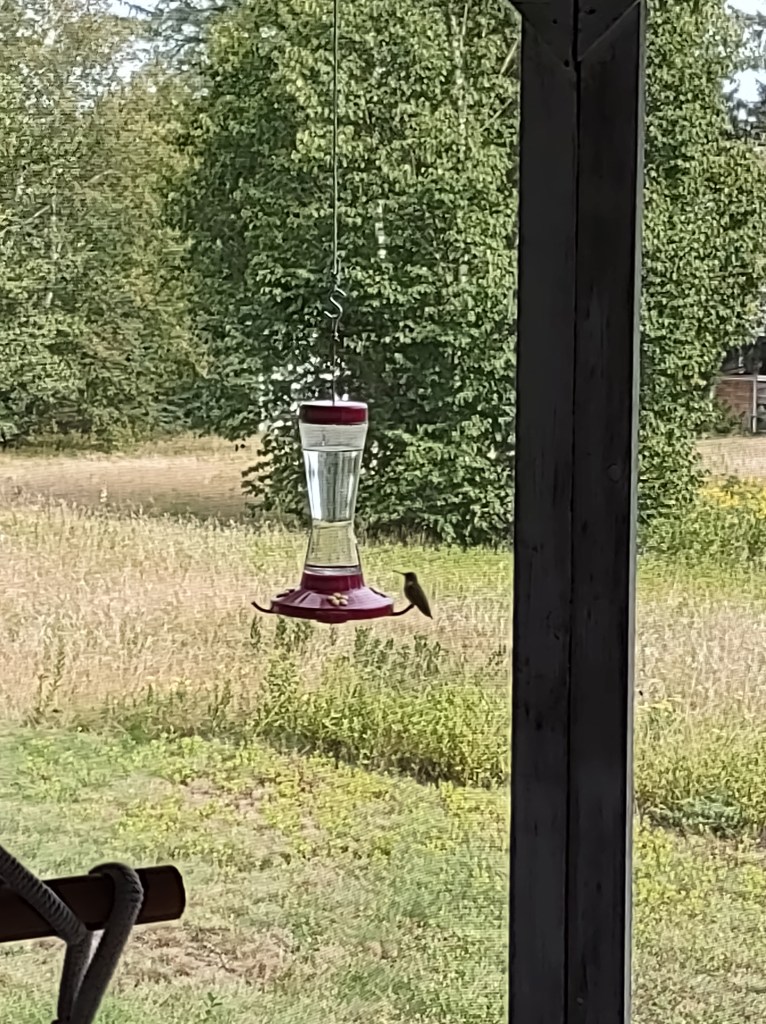 [Below photo: A poor quality photo, taken with a phone through both glass and screen, of a hummingbird at the feeder on the Island. She provided me with endless entertainment, as did her 4 babies when they learned to fly.]